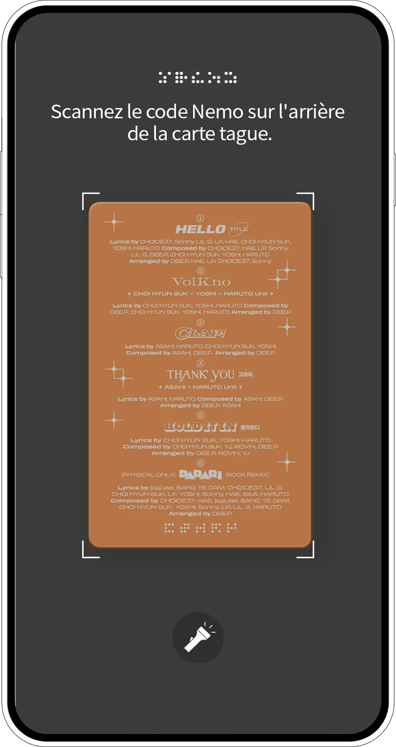Appuyez sur le bouton + en haut de l'application pour scanner le Nemo Code au dos de la carte par la fonction de Nemo Code. Le Nemo Code est une mode nouvelle de vérification composé de cinq blocs carrés et d'un filigrane numérique invisible.