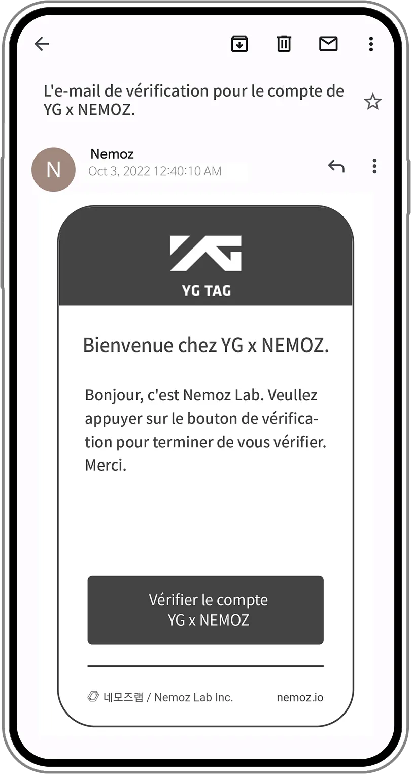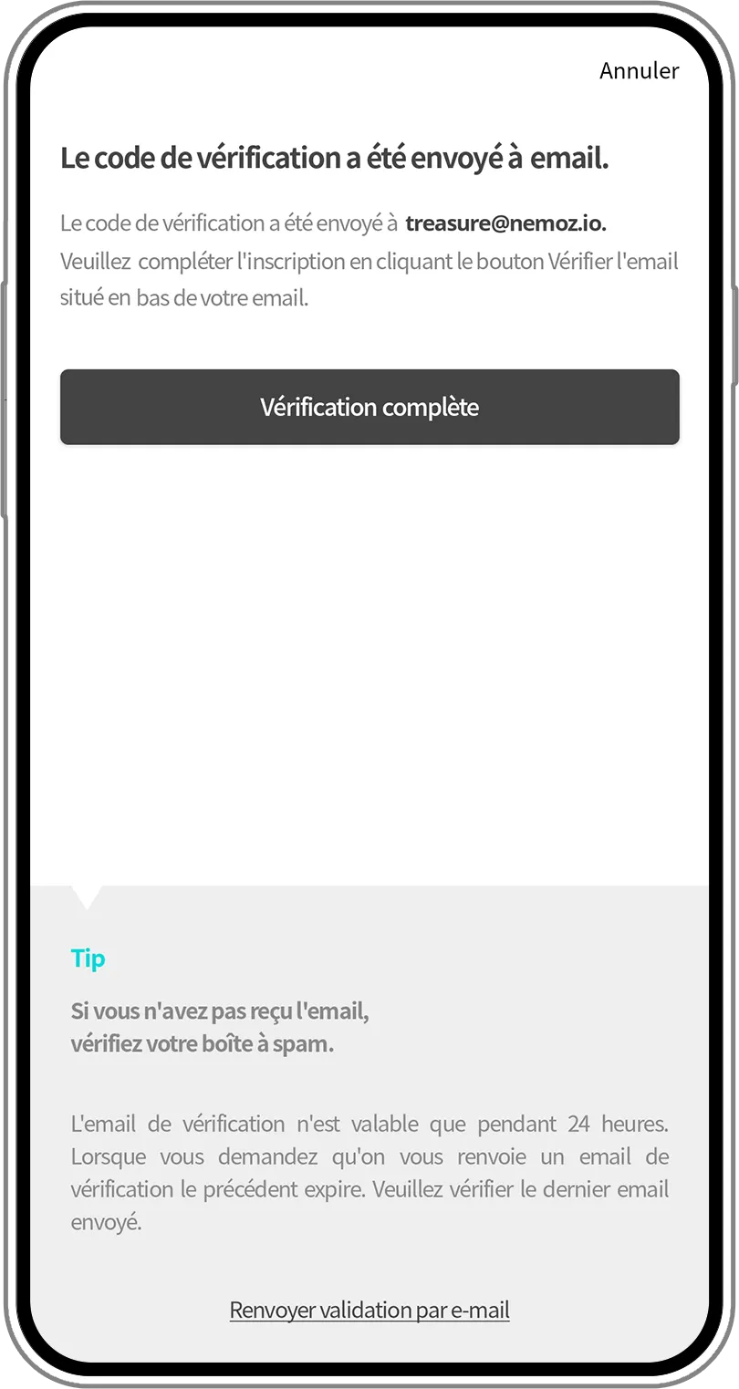 Un e-mail de vérification a été envoyé à l'adresse e-mail que vous avez saisie dans votre identifiant. Cliquez sur le bouton "Vérification du membre TG X NEMOZ" dans e-mail. Si vous ne recevez pas d'e-mail de vérification dans une minute, veuillez vérifier votre boite spam.
