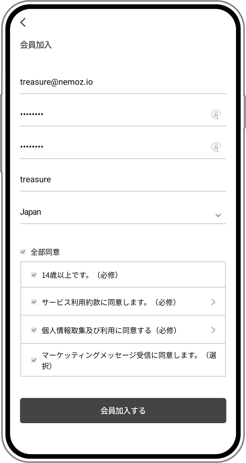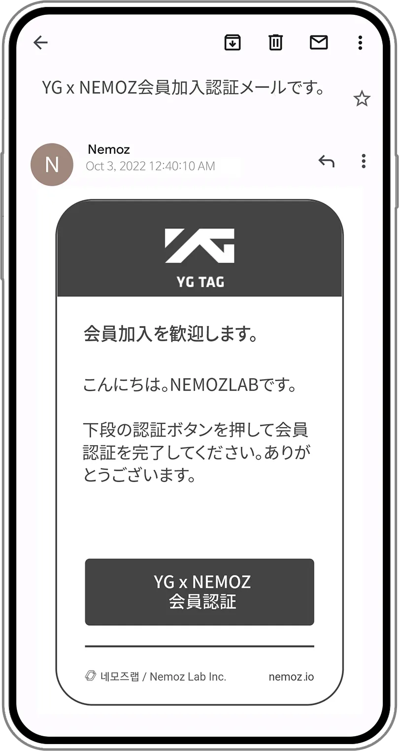 IDに使用したアドレスに認証メールが送信されました。 メールを開き「YG x Nemoz会員認証」ボタンを押してください。 1 分以内に認証メールが届かない場合は、スパムメールを確認してください。
