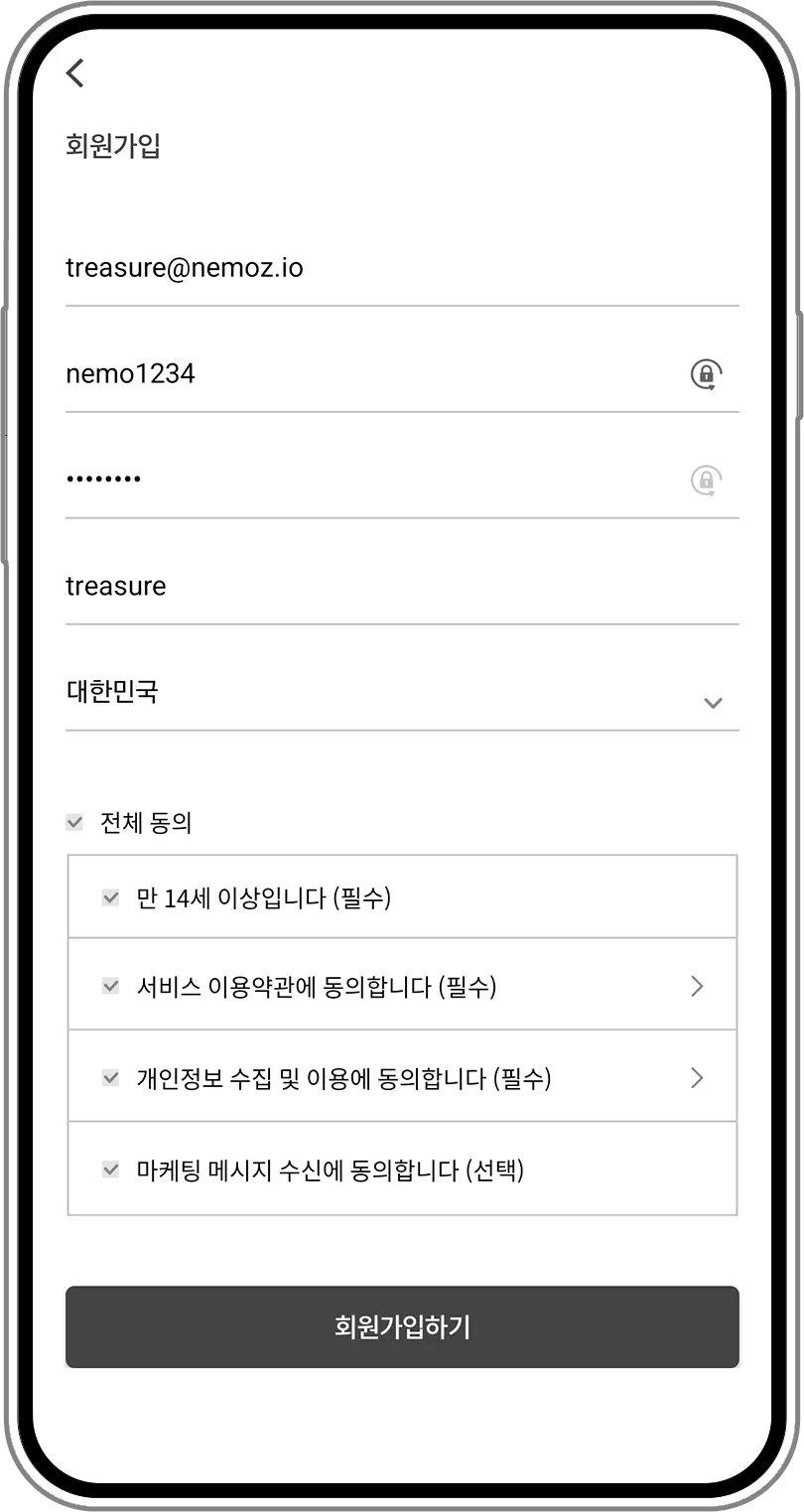 하단의 ‘회원가입하기’ 버튼을 눌러주세요.