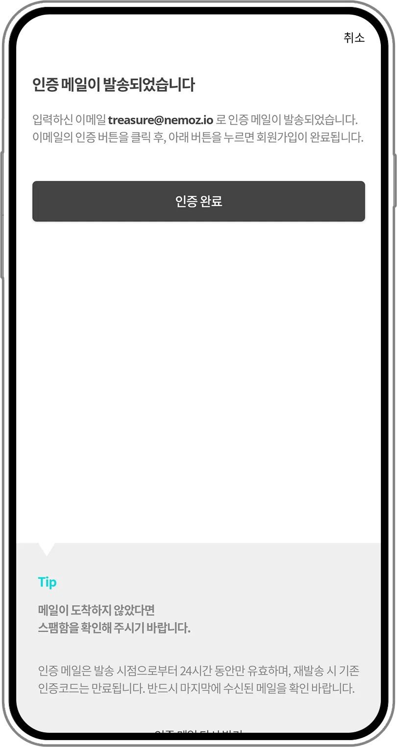 YG x NEMOZ 앱에서 ‘인증완료’ 버튼을 눌러주세요.
