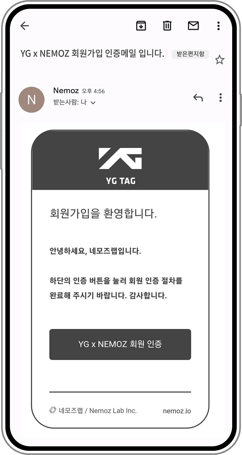 아이디에 사용한 이메일로 인증 메일이 발송됐습니다. 이메일의 ‘YG x NEMOZ 앱 회원 인증’ 버튼을 눌러주세요. 1분 이내에 인증 메일이 도착하지 않을 경우, 스팸함을 확인해주세요.