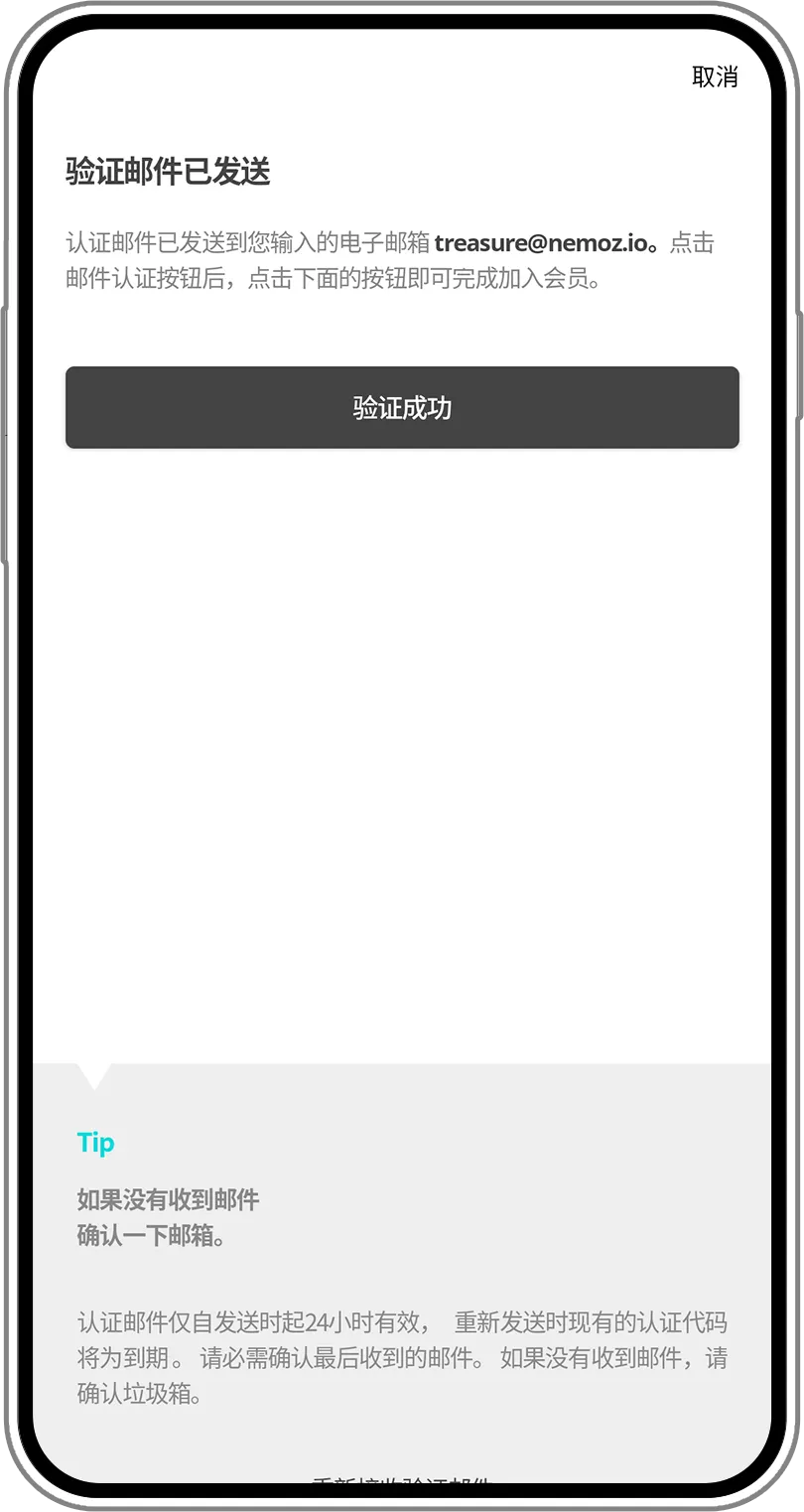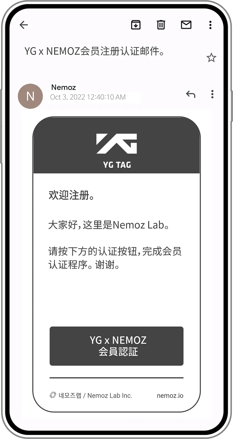 验证邮件将发送到用户名中使用的邮箱。请点击邮箱中的"YG x NEMOZ会员认证"按钮。 如果1分钟内没有收到验证邮件,请确认邮箱的垃圾箱。